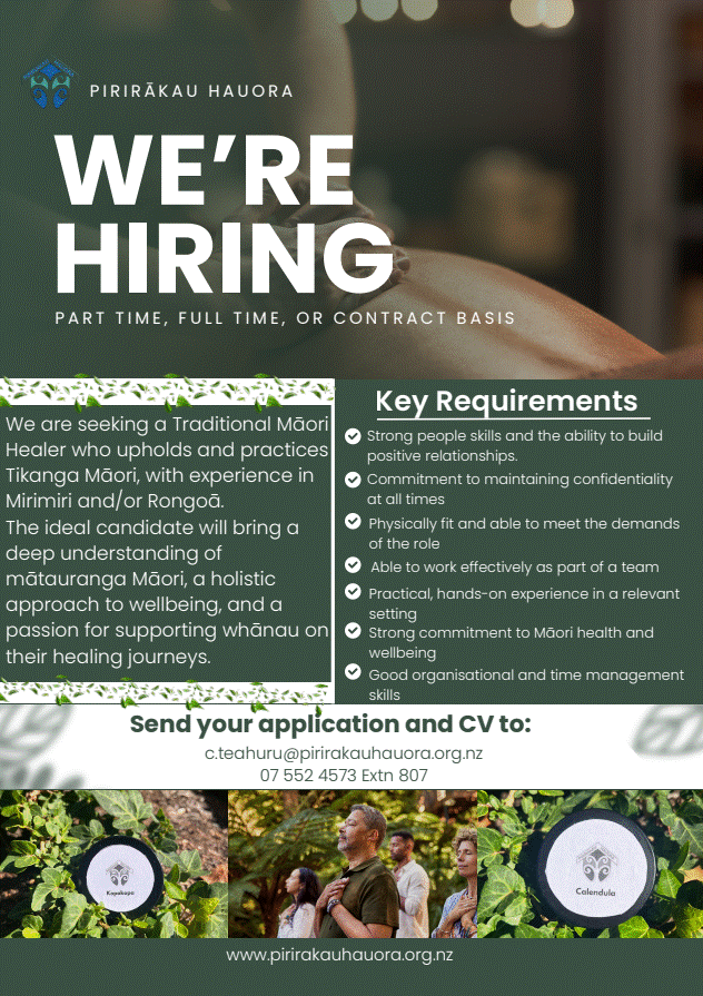 Carl Te Ahuru at c.teahuru@pirirakauhauora.org.nz